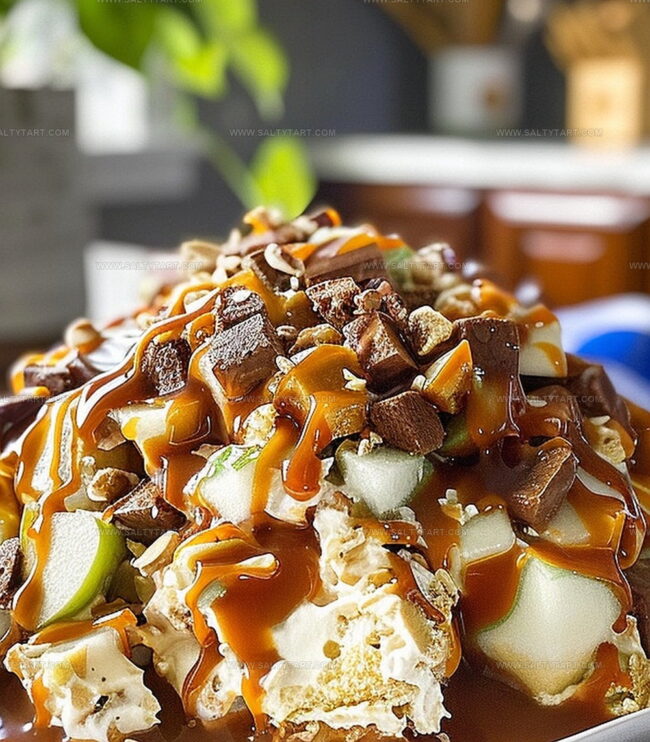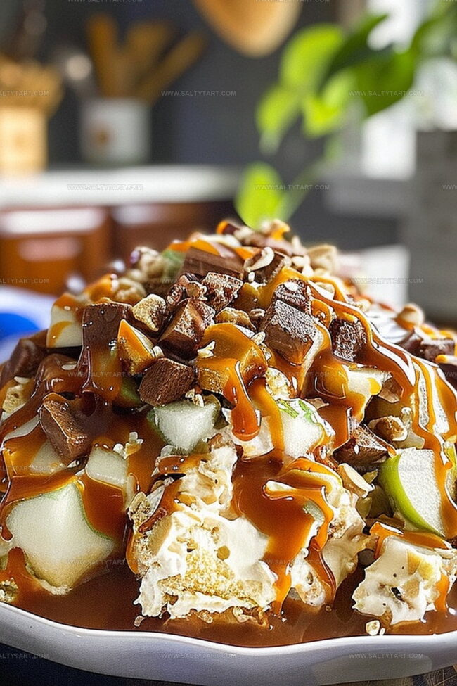 - Gracefully drizzle caramel sauce over the mixture, creating a glossy coating that intertwines with the apple and candy pieces.