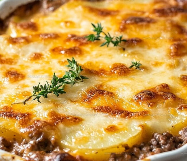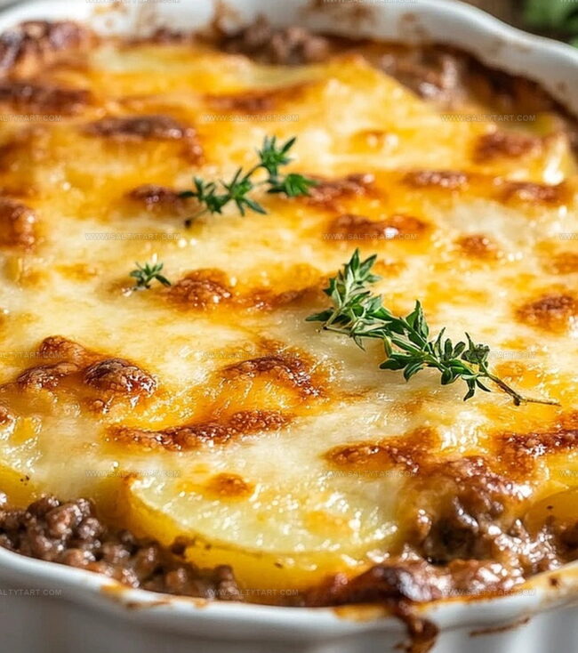 Layers of golden potatoes intermingle with seasoned ground beef and melted cheese.