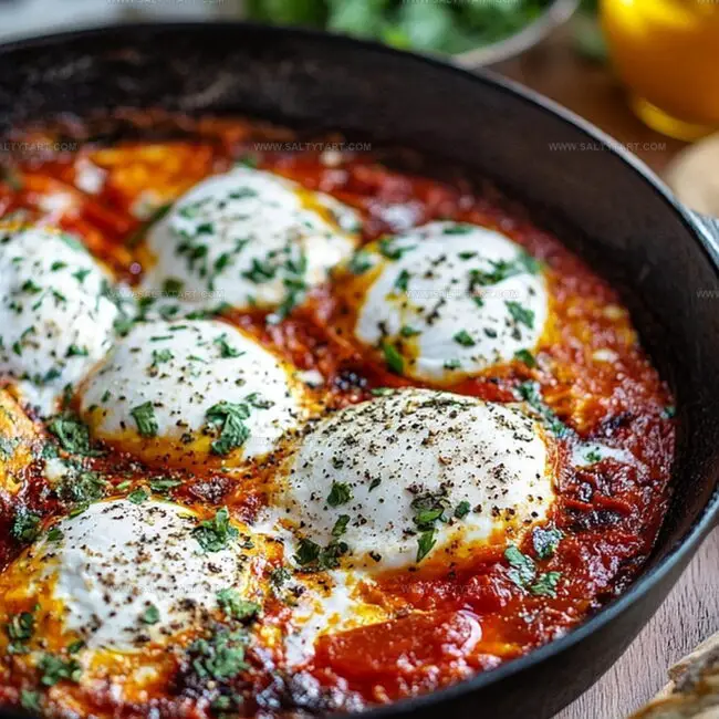 Eggs nestle gently in a spicy tomato sauce, creating a symphony of taste and texture.