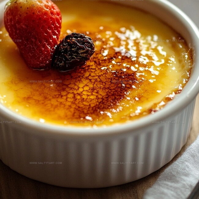Garnish the creme brulee with a small handful of fresh raspberries or strawberries, adding a tart, vibrant contrast to the smooth custard and caramelized sugar top.