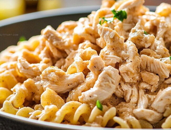 Tender chicken pieces melt into a rich, velvety sauce that hugs each pasta strand.