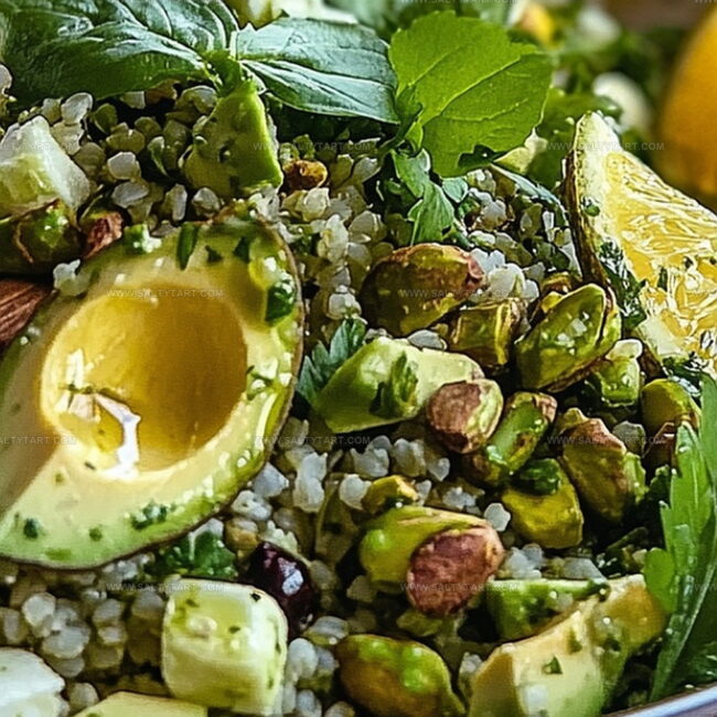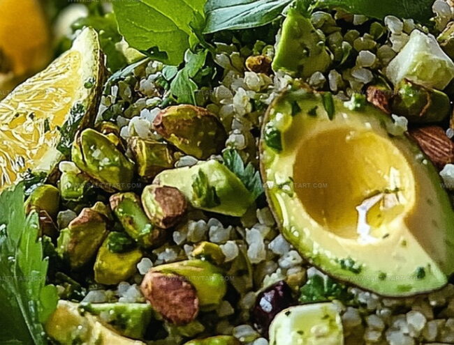 Herbed freekeh salad dazzles Mediterranean palates with its zesty citrus vinaigrette and nutty grain blend. Crunchy pistachios and creamy avocado dance together, delivering a refreshing meal you’ll savor from first bite to last.