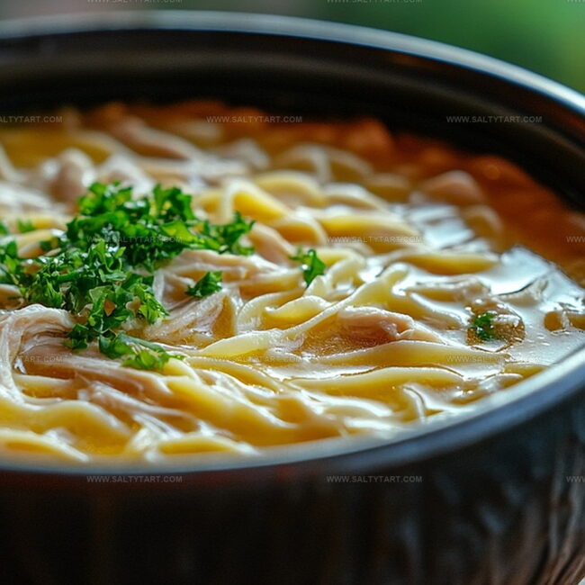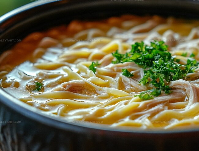 Tender chicken pieces nestle among soft, perfectly cooked noodles in a rich, golden broth.