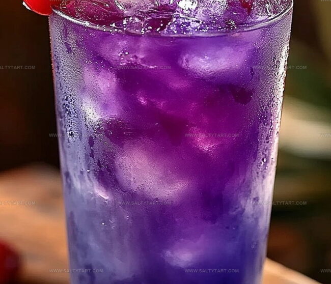 The blue curacao and grenadine syrup interact to create a beautiful purple gradient when mixed, giving the drink its stunning visual appeal.
