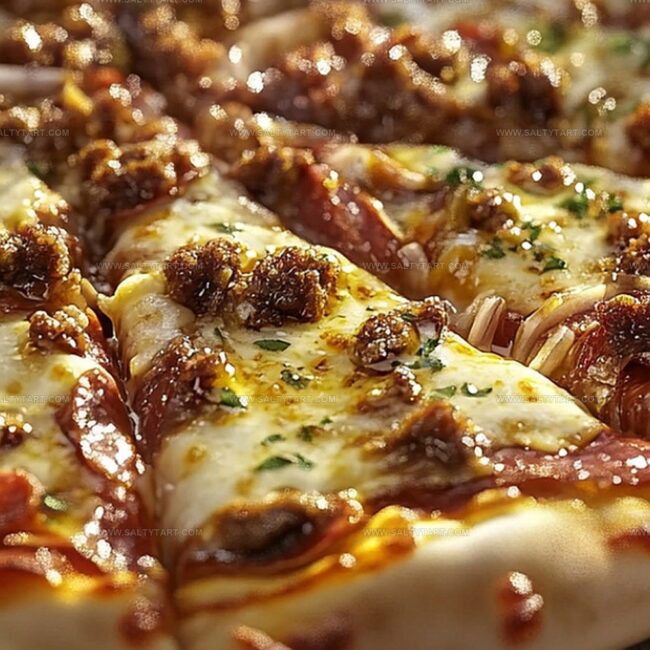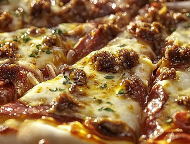 Scatter the cooked meat across the cheesy landscape. Add another cheese avalanche on top, then sprinkle Italian seasoning for that extra flavor punch.