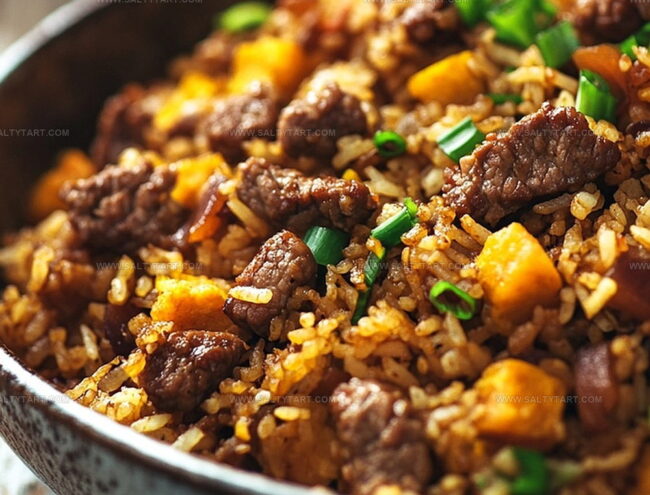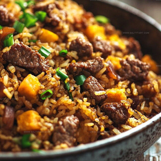 Robust beef chunks nestle between fragrant rice grains, creating a symphony of textures that feels both familiar and exciting.