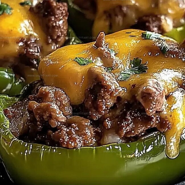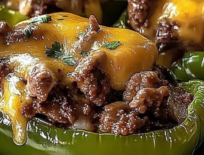 Tender bell peppers cradle savory beef, melted cheese, and caramelized onions for an irresistible meal.