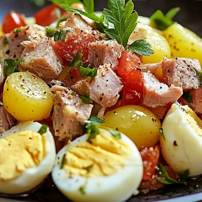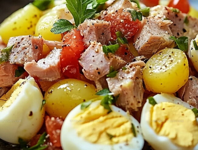 Mediterranean potato salad delights with zesty tuna and creamy hard-boiled eggs, offering a perfect balance of flavors. Quick and easy to prepare, this dish brings coastal charm straight to your summer table, ensuring pure culinary satisfaction.