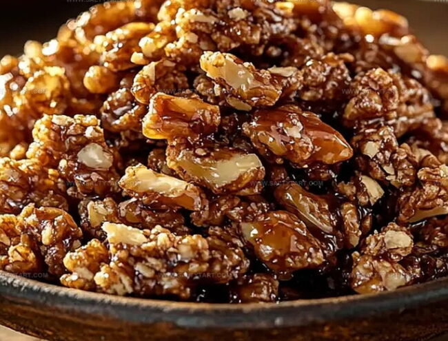 - Gently cascade the praline mixture over the cereal and pecans, meticulously folding to achieve comprehensive coverage.