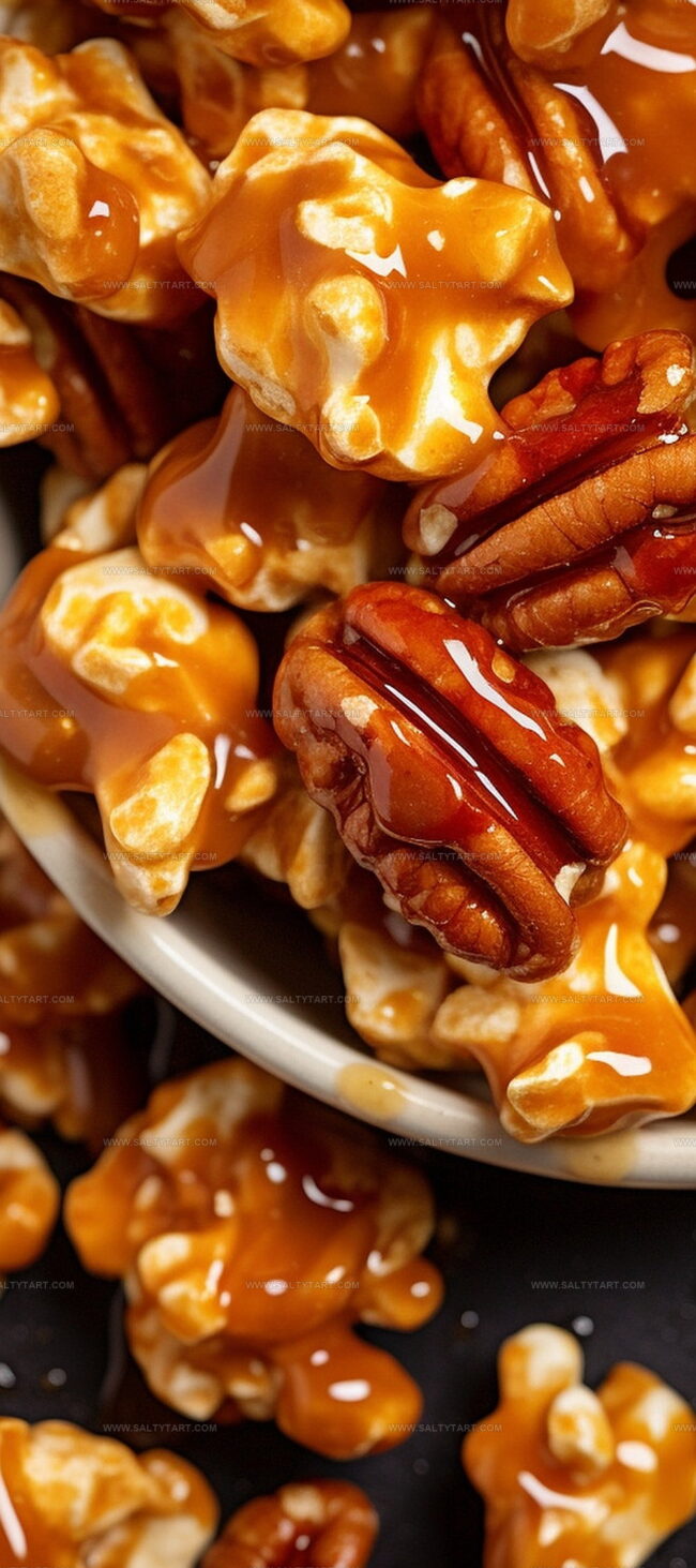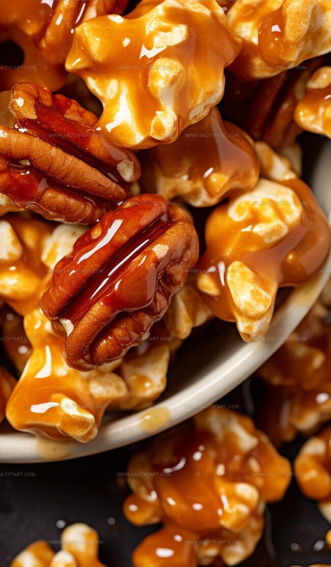 - Drizzle the molten caramel over the popcorn and pecan mixture, gently folding to achieve comprehensive coating.