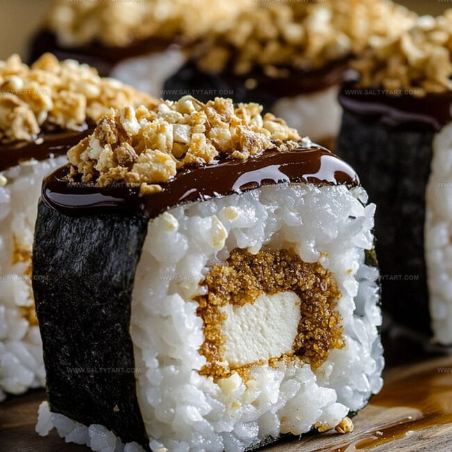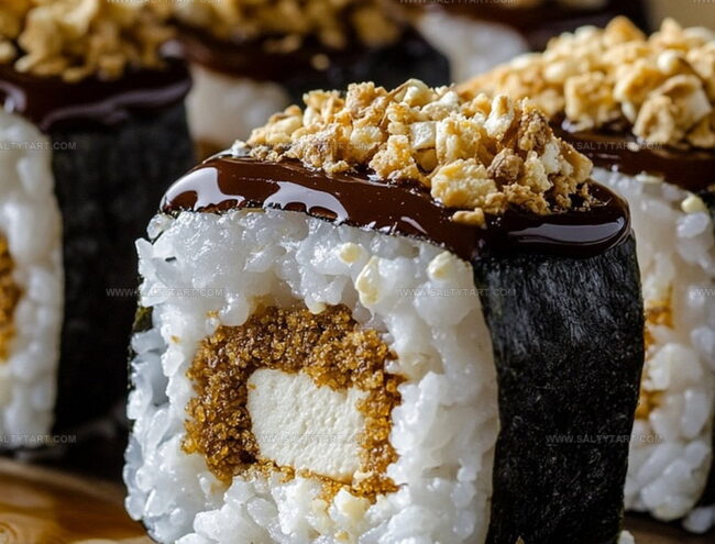 - Before presenting, embellish the sushi rolls with a delicate chocolate sauce drizzle and a light dusting of additional graham cracker crumbs for enhanced texture and visual appeal.