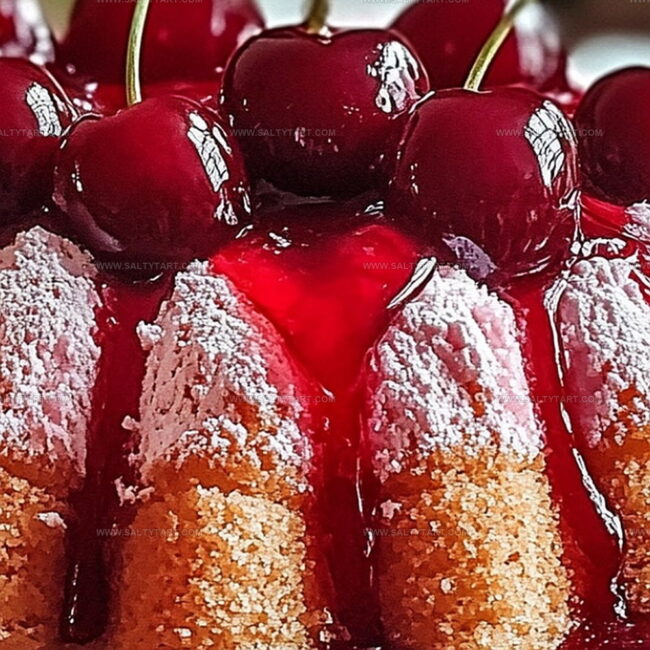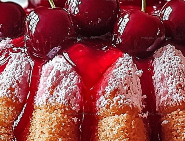 Vibrant red cherries dance through soft, tender crumb, creating a dessert that sparkles with retro charm.